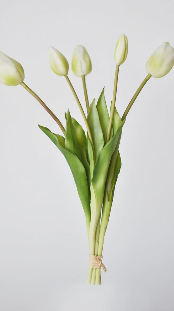 These hand finished tulips are white, with accents of green to look like just blooming tulips. They are not made or silk but instead made of molded poly material to give a realistic feel and look.
