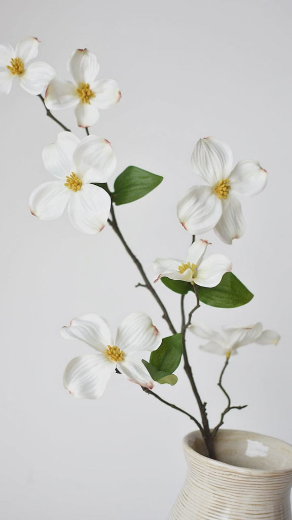 One of our favorite signs of spring is when the dogwood trees bloom! They always make us so happy! AND OF COURSE, we want to bring them inside! These beautiful dogwood blossoms on this branch are the perfect solution to add some height to a vessel or arrangement, without making it really dense! All of the stems are wired, so you have complete control!
